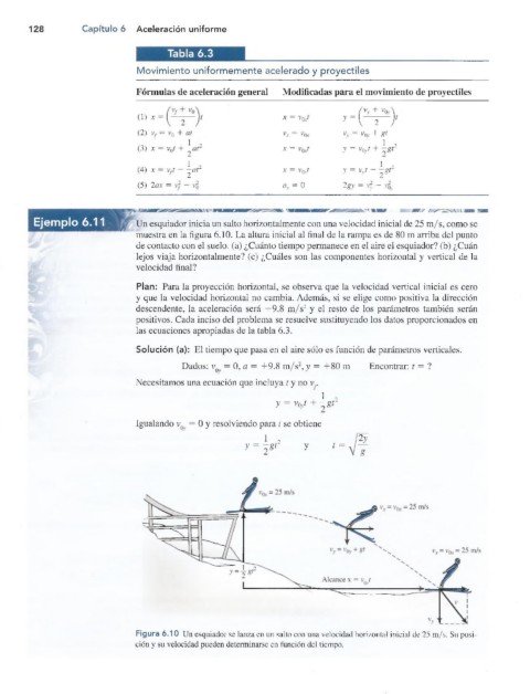 Figura 6.10 Un esquiador se lanza en un salto con una velocidad horizontal inicia] de 25 m/s. Su posi