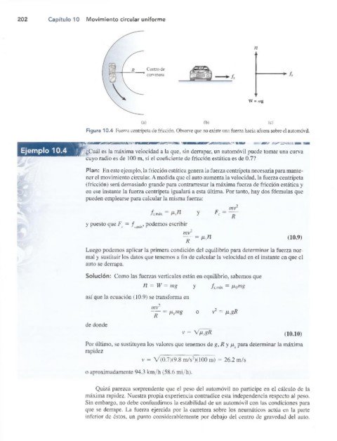 Ejemplo 10.4 |f ¿Cuál es la máxima velocidad a la que, sin derrapar, un automóvil puede tomar una curva