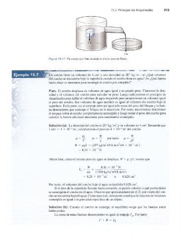 Ejemplo 15.7 Un corcho tiene un volumen de 4 cm3 y una densidad de 207 kg/m 3. (a) ¿Qué volumen