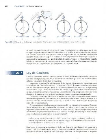 Figura 23.12 Carga de un electroscopio por inducción. Observe que la carga residual es opuesta a la del cuerpo de carga.